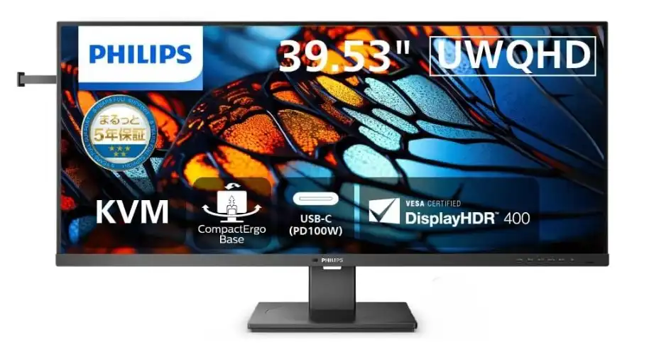 フィリップス(PHILIPS)のモニターで「40B1U5600/11」のご紹介です。約40インチの大画面のウルトラワイド液晶モニターで、USB-Cを搭載している点が魅力。発売日は2024年1月のビジネス向け製品です。