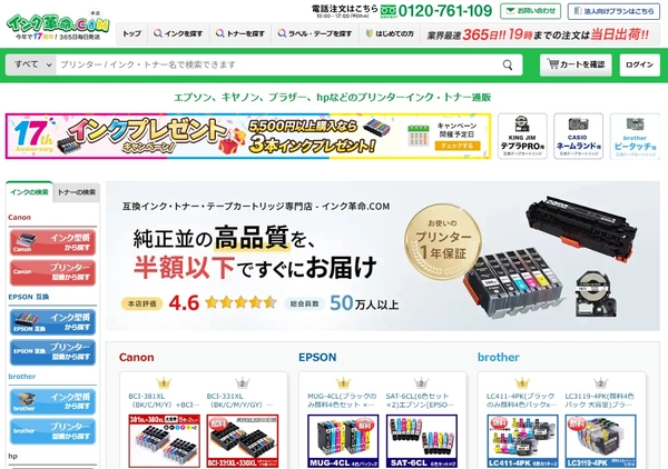 インク革命.COMは、プリンターインク・トナー専門の通販サイトで、エプソン、キヤノン、ブラザー、HPなど主要メーカーの互換インク・リサイクルインクを取り扱っています。
